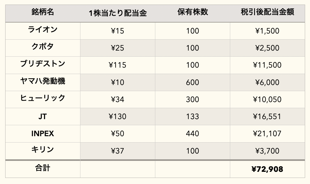 3月は12月決算の企業から配当金が入金されました。ほとんどNISA口座で保有していますが、特定口座で保有しているものもあり、特定口座の配当金は約20%の税金が引かれます。税引後の受け取り配当金の合計は72,908円でした!詳細を以下の表にまとめました。