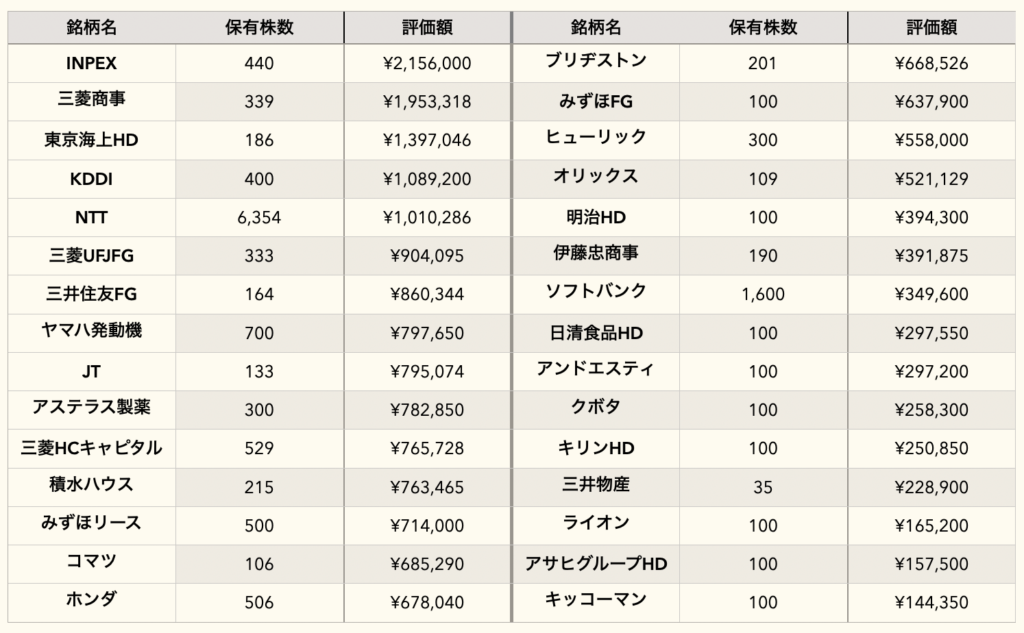 2026年3月28日現在の個別株評価額は20,673,566円。値上がり率+56.7%、+7,556,112円です。ホンダと積水ハウスの旧NISA口座で保有していた分を売却してNISA口座で買い直したので、取得利回りが少し上がってしまいましたが、仕方ないかな。各銘柄の保有株数と評価額は以下の表の通りです。