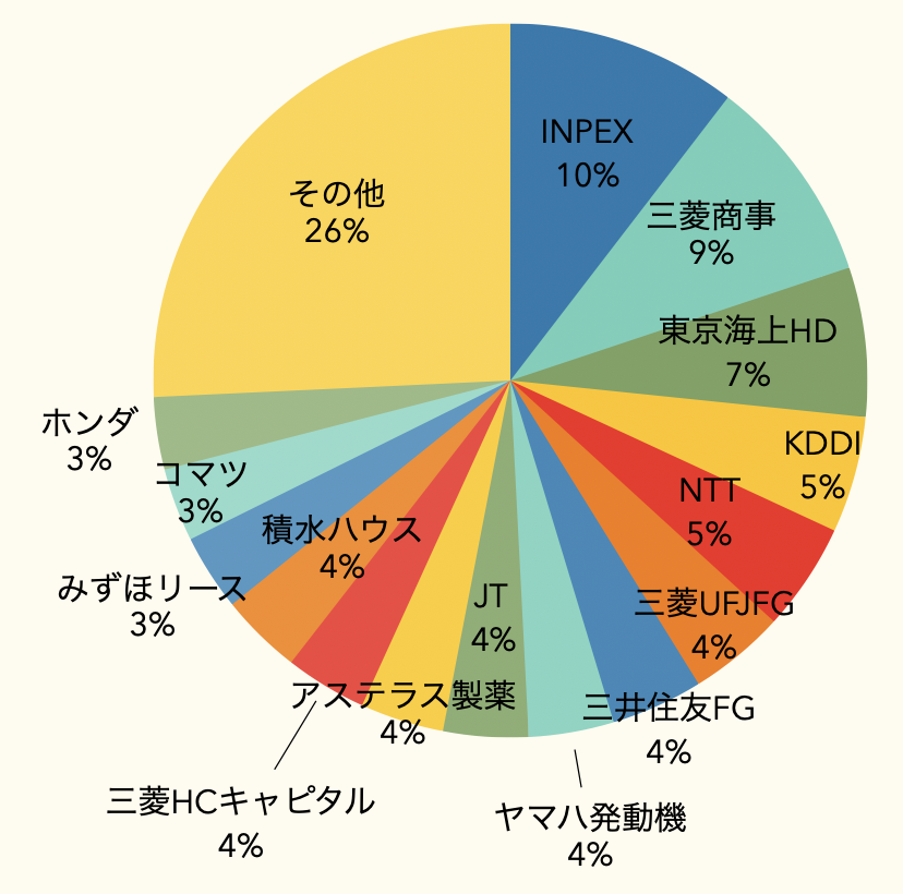 中東情勢の緊迫化の影響でINPEXや三菱商事の株価が急上昇し、この2銘柄の保有割合が大きくなってきました。また、東京海上は投資の神様が経営するバークシャー傘下と業務提携すると発表してから2日連続ストップ高となり、こちらも保有割合が上がりました。株価が急上昇しても売却はせず、他のセクターの株を買い増すことでバランスを取ろうと思っています。